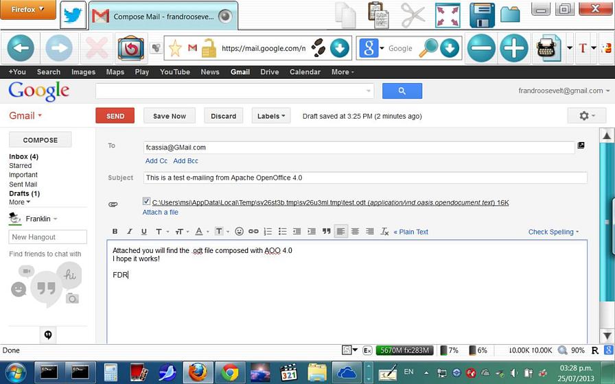 3. GMail opens up with your system default web browser with a GMail email compose window, and the AOO document attached to it.
